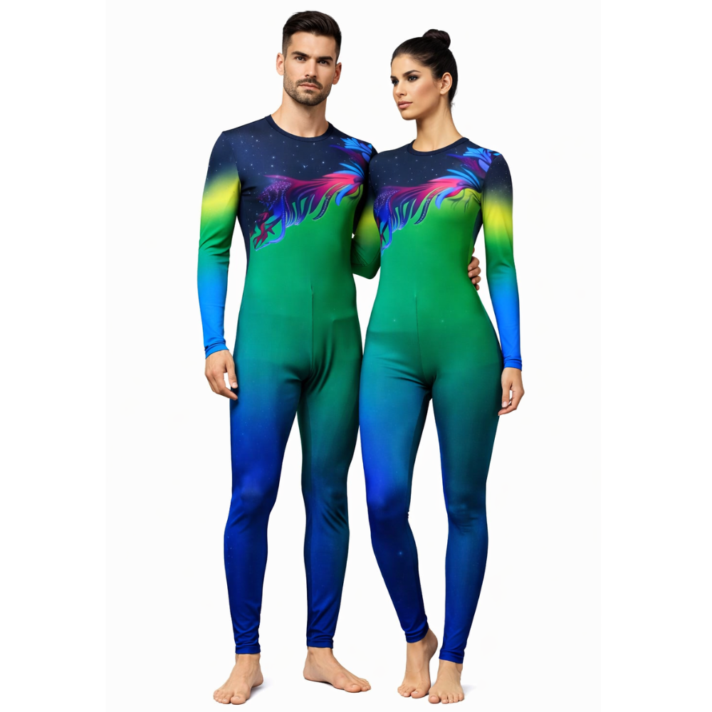 Introducing the Blue & Multi-Colored Printed Unitard, the perfect blend of style, comfort, and performance for all your physical activities. Designed with vibrant multi-colored patterns, this full-sleeve unitard is crafted to enhance both functionality and aesthetics, making it ideal for yoga, dance, acrobatics, aerobics, and more. Made from high-quality, stretchable fabric, it offers a snug yet flexible fit, allowing for complete freedom of movement. Whether you’re stretching in yoga, flowing through dance routines, or performing acrobatic stunts, this unitard ensures you feel unrestricted and supported. The breathable, moisture-wicking material keeps you cool and dry even during the most intense workouts. Its full-sleeve design provides extra coverage while still allowing you to move with ease, making it perfect for any climate or workout environment. The eye-catching blue and multi-colored print adds a fun and fashionable twist to your activewear wardrobe. Tailored for durability, this unitard stands up to rigorous activity, retaining its shape and vibrancy through repeated wear and washes. Whether you’re performing or practicing, this multi-functional unitard is the go-to choice for comfort, style, and performance. Elevate your workout experience with the Blue & Multi-Colored Printed Unitard!