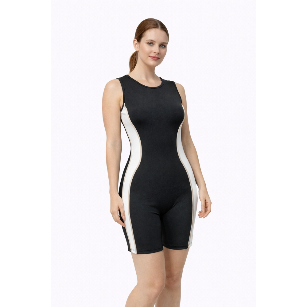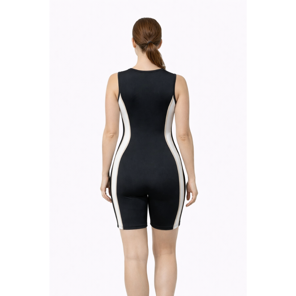 Designed for performance and comfort, this unisex black and white sleeveless unitard (biketard) is ideal for a wide range of fitness and athletic activities. Made from stretchable, lightweight, and comfortable fabric, it allows complete freedom of movement while maintaining a sleek, body-fit look.