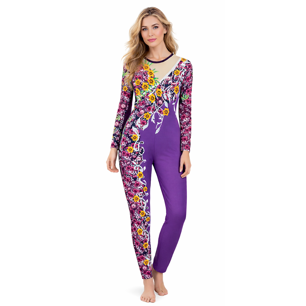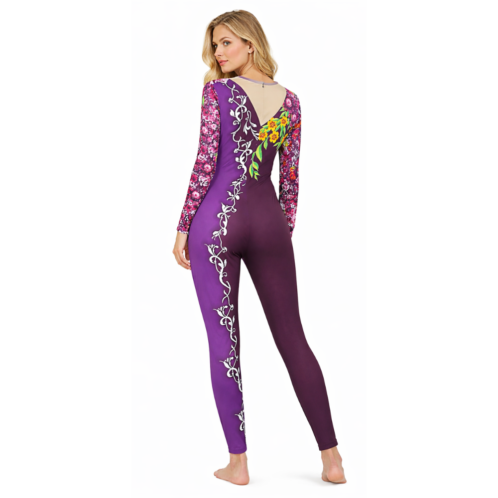 The design is truly a head-turner: a solid purple base, and for a contrast, one sleeve is covered in a multicolor floral print, while the other features a delicate belt-style floral motif flowing from the chest to the ankle of a single leg.