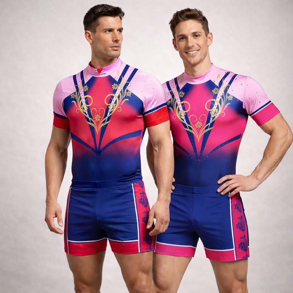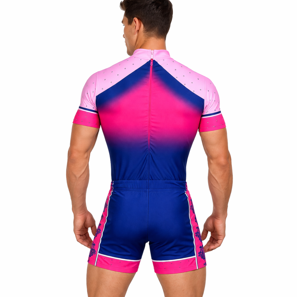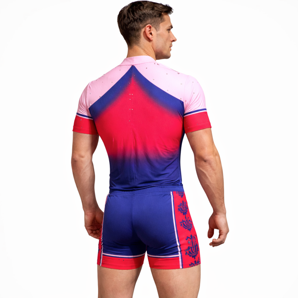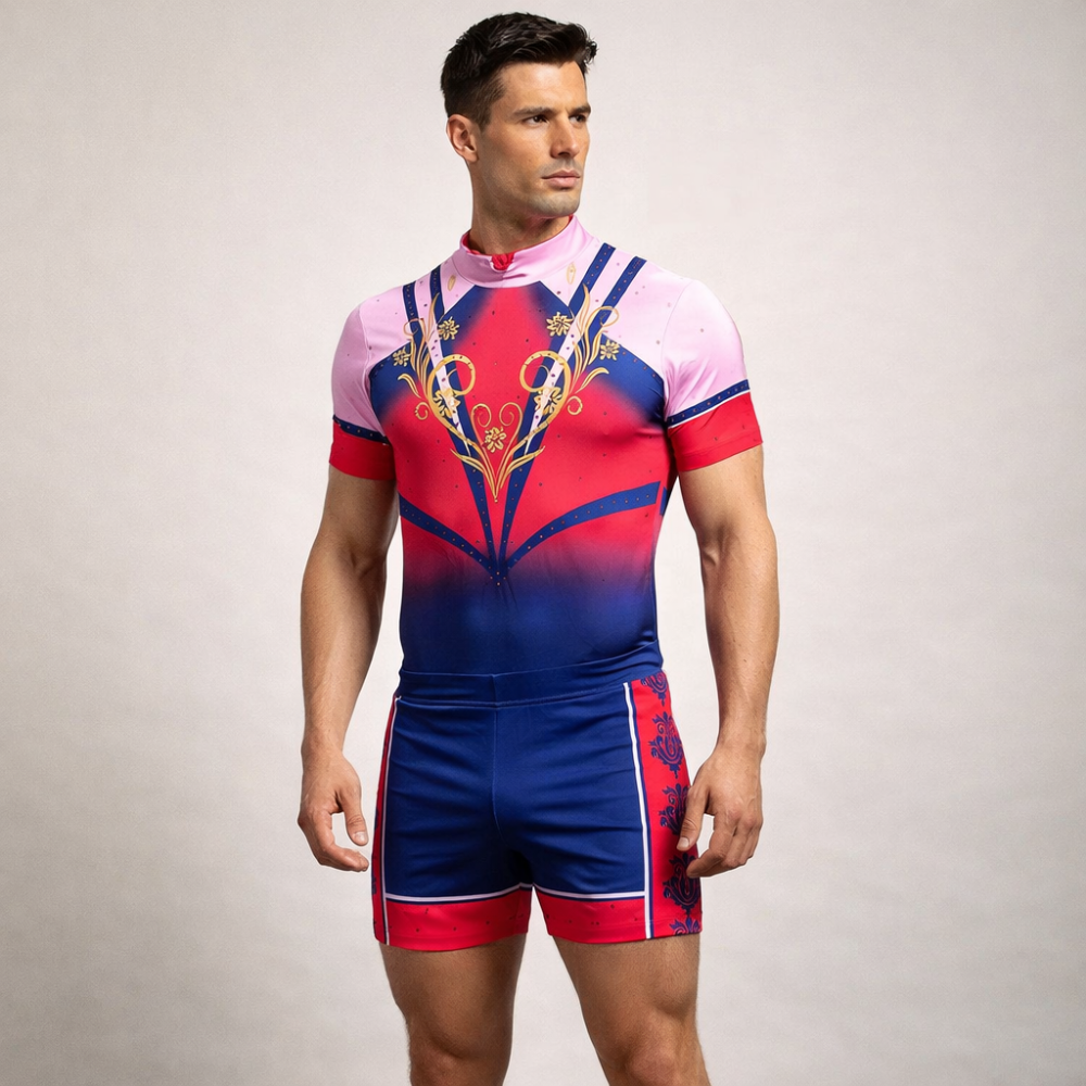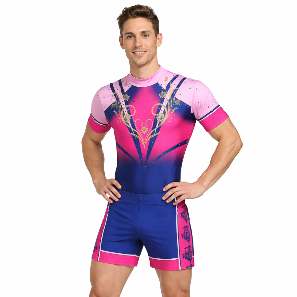 Perform with confidence and style in the Floral Ombre Power Leotard with Shorts, available in Pink & Blue and Red & Blue sublimation prints. Designed for boys, this costume delivers both comfort and striking stage presence.