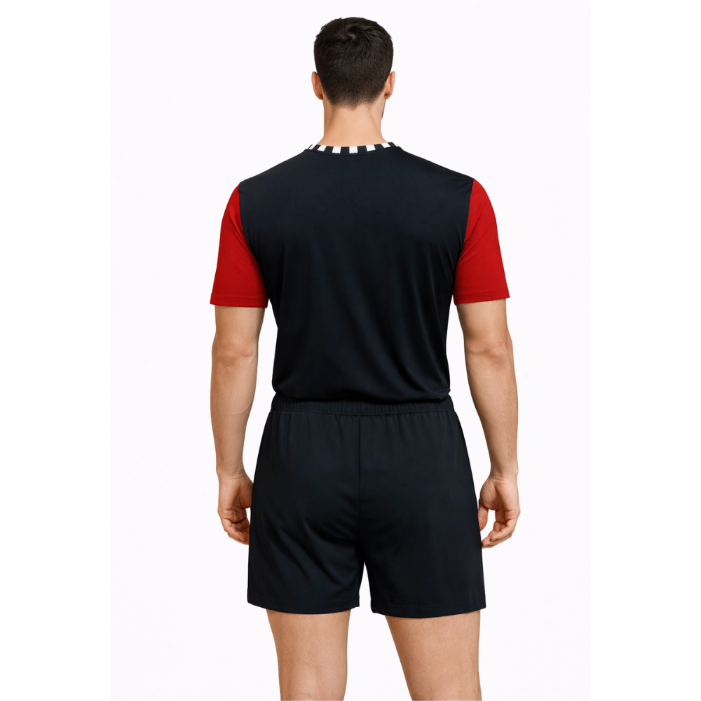 - A solid black back paired with matching shorts creates a sleek, balanced look, while the vibrant red sleeves elevate the costume’s modern and dynamic aesthetic.