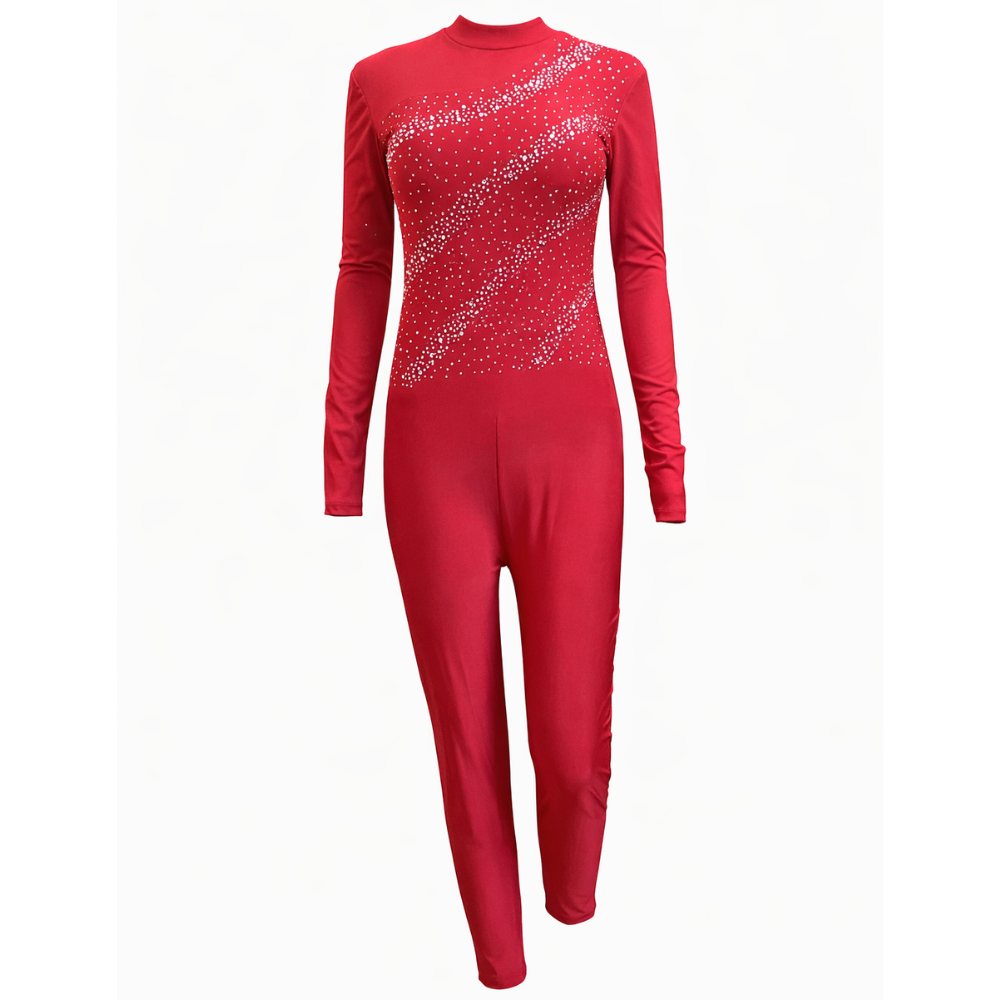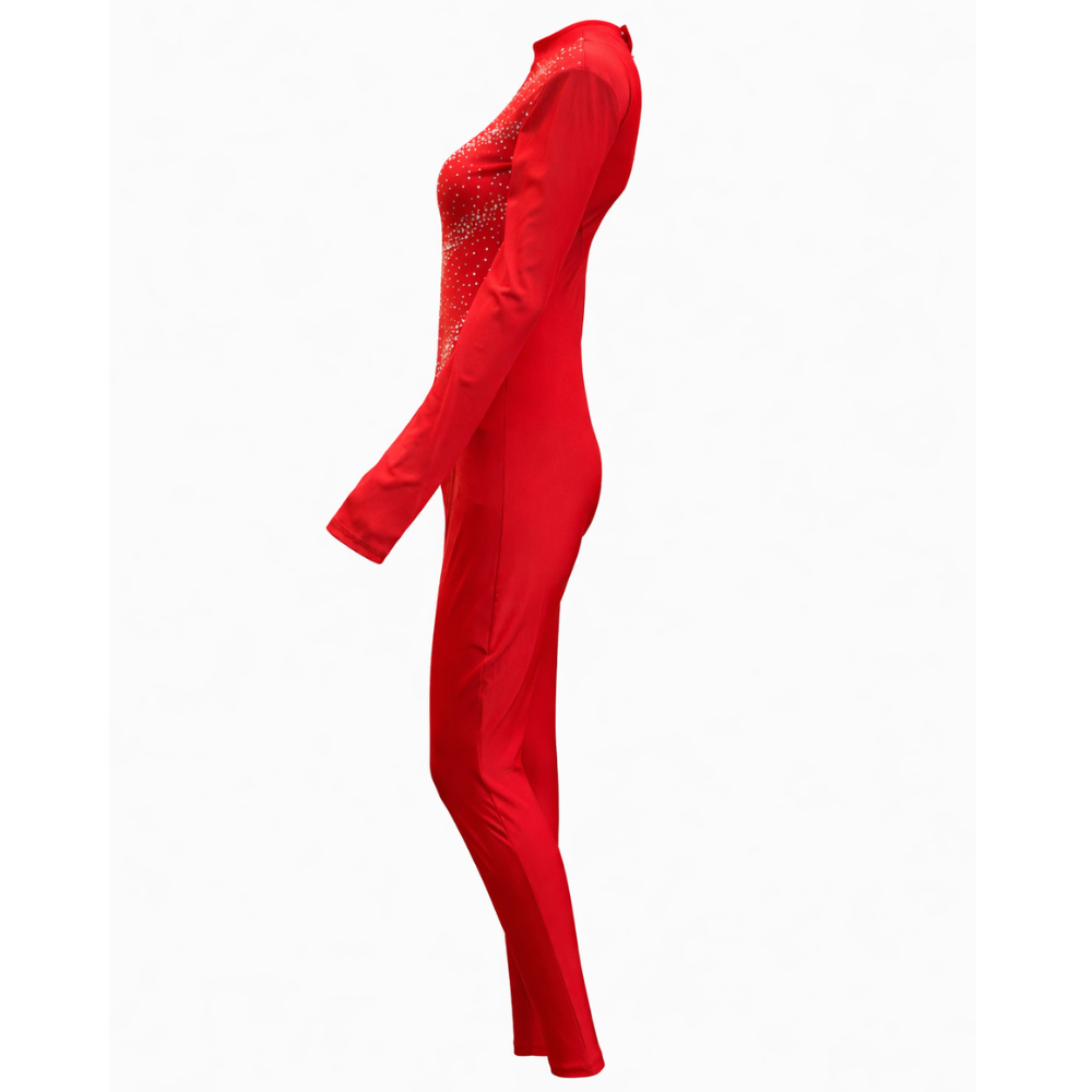 Make a bold statement with this premium exclusive solid red unitard, designed for high-performance and elegance. Crafted in soft, fully stretchable Lycra fabric, it offers exceptional comfort and flexibility for demanding performances. The full-sleeve silhouette is complemented by a stylish large back keyhole design, adding a touch of sophistication.