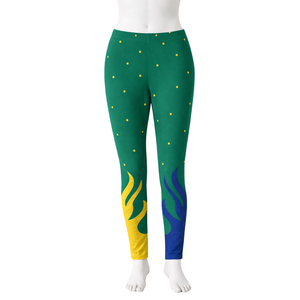 Add a bold and stylish touch to your activewear with these premium stretch yoga leggings for girls. Designed with a full green right leg, yellow fiery and a blue fiery print on the left leg, these leggings bring colour, energy and comfort together in one smart design.