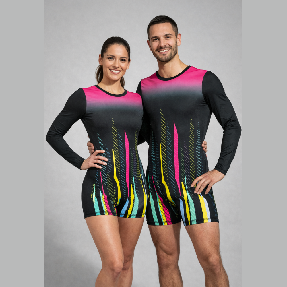 The bold cosmic line sublimation print adds an energetic, sporty edge perfect for athletes and performers who love standout training wear. With full sleeves for added coverage and support, this gymnastics biketard is ideal for dance, yoga, acrobatics, skating, aerobics, cycling, and all kinds of fitness routines. Lightweight, breathable, and performance-ready, it’s built to move with you every rep, every routine.
