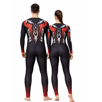 Designed for movement and style, this black and red leotard with leggings features a unique random leaf design at the edges, accented with scattered grey dots that create the effect of shimmering silver stones. The full sleeves showcase a bold red and black ombré print, adding a dynamic touch. A back zip ensures a secure and comfortable fit, while the leaf print at the bottom of the legs ties the design together.Perfect for yoga, freestyle dance, Shiva-themed performances, figure skating, roller skating, and other physical activities, this set blends flexibility, elegance, and performance-ready comfort.