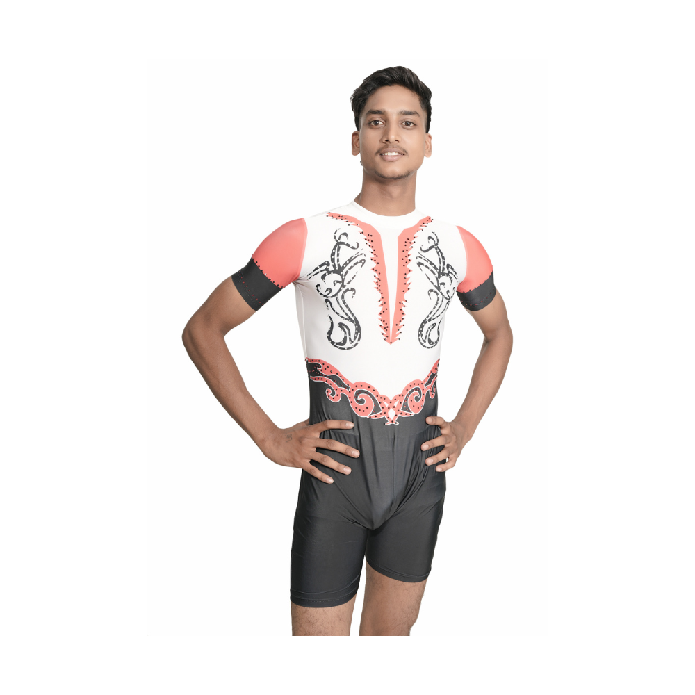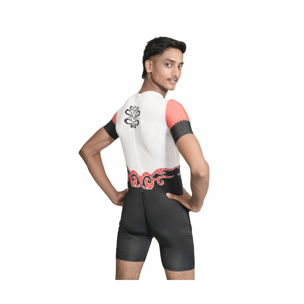 Unleash your energy with the Dynamic Edge Biketard a stunning amalgamation of style, precision, and performance-ready design. Crafted with a vibrant sublimation print, the upper body features a white base with a red and black belt-inspired design flowing into a solid black lower half. Short red and black sleeves add a modern touch, while a standing collar gives the outfit a regal silhouette.