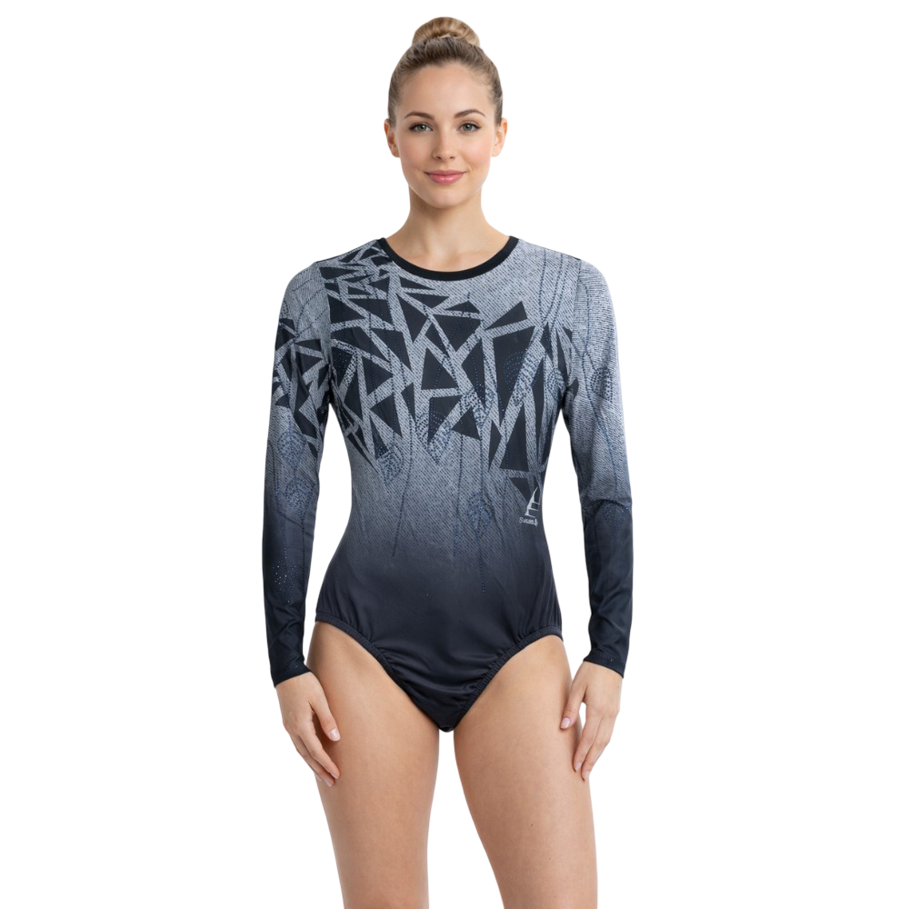 Step into elegance and power with our Grey Ombre Eclipsed Harmony Leotard, designed especially for girls and women who love to move with grace and confidence. This stunning leotard features a premium grey-to-black ombré finish combined with fully embellished geometric detailing, creating a bold yet classy look perfect for training, competitions, and stage performances. The round-neck design and full sleeves provide complete coverage and an elegant silhouette, while the high-stretch washable Lycra fabric ensures maximum flexibility, durability, and comfort during demanding routines. Whether you’re practicing artistic gymnastics, Mallakhamb, aerial, skating, yoga, or dance — this leotard delivers style, support, and performance in every move.