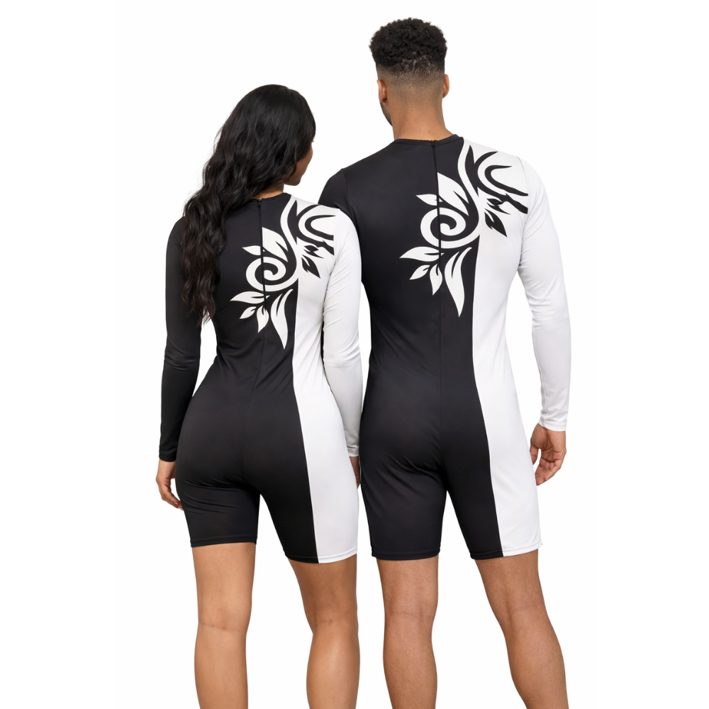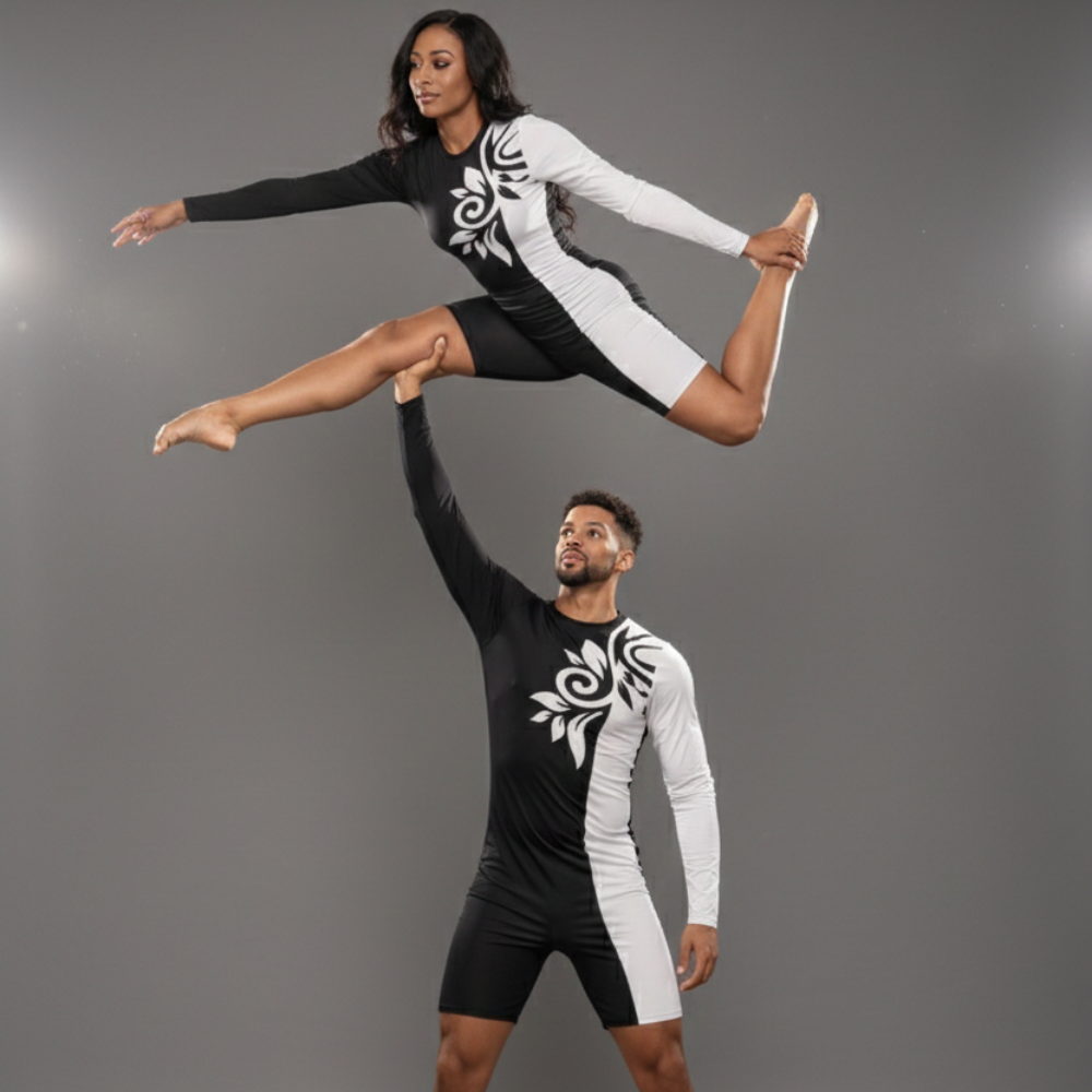 Elegant Edge: White & Black Biketard is crafted for performers and athletes who want a bold look with full flexibility. Designed in a striking black-and-white contrast with a modern swirl print, this full-sleeve biketard combines comfort, style, and performance for gymnastics, dance, yoga, acrobatics, and figure skating practice.