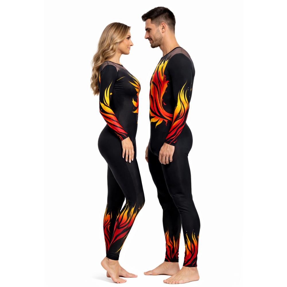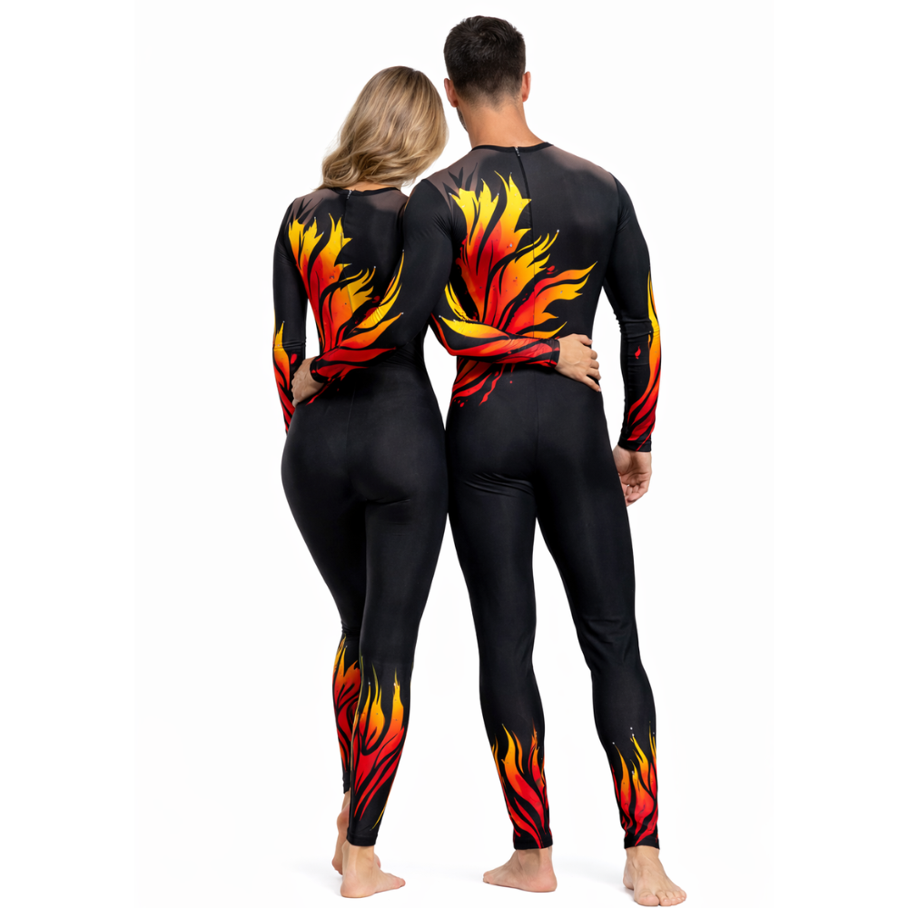 Turn up the heat on every move with the Fiery Flavor – Tone Black Unitard for Yoga, designed for power, flexibility, and full-body comfort. This stunning black unitard features a bold flame-inspired sublimation print in red, orange, and yellow tones, creating a striking stage-to-studio look.
