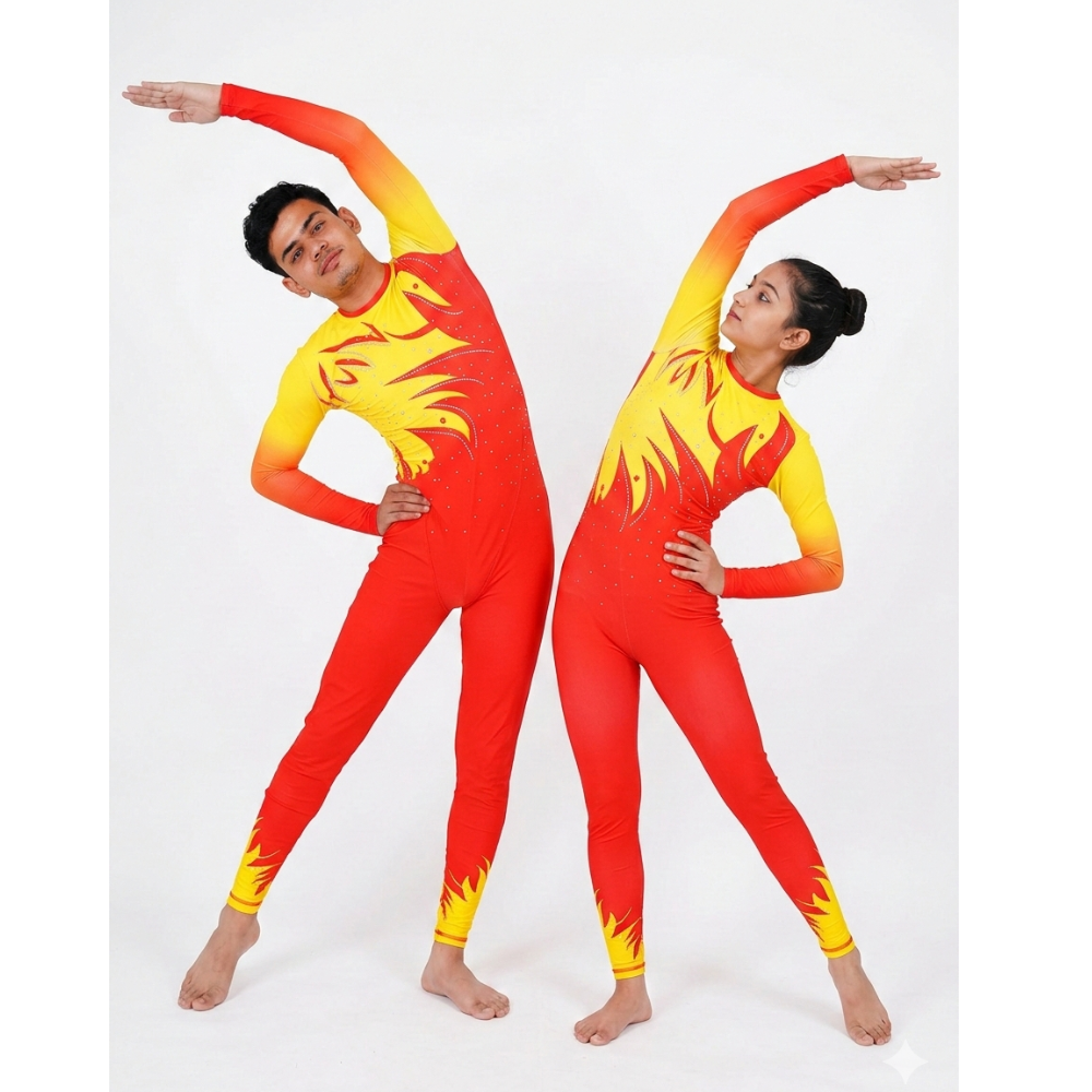 This colorful one-piece is ideal for creative yoga, traditional yoga, and dance performances. It has a vibrant yellow and red gradient print that resembles a sunset. It is the perfect combination of comfort and maximum flexibility for yoga, acrobatics, and aerobics because it is made of stretchy lycra fabric. The design has a back zip for effortless dressing and a round collar for a sleek appearance. It lacks the particular skin-and-black print sleeve style, but its striking mustard and red hues and fine details give it an eye-catching appearance. A striking presence on stage is guaranteed by this unitard’s flawless color and print blend, which makes it ideal for a variety of performance contexts.