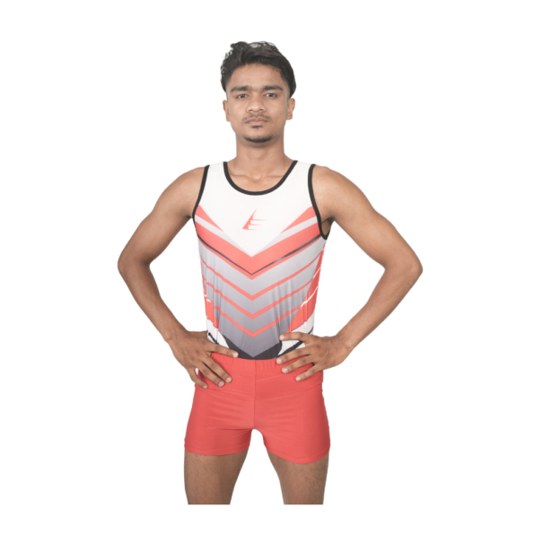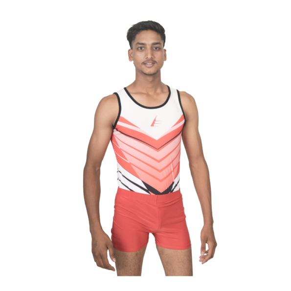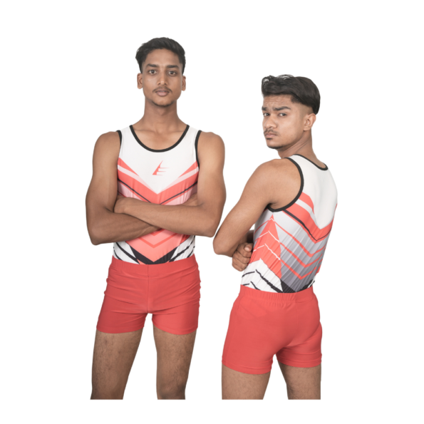 The design comes to a halt with attached red shorts, offering secure coverage and total freedom of movement. Whether on the mat or podium, this costume can keep up with high-intensity training and competitions.