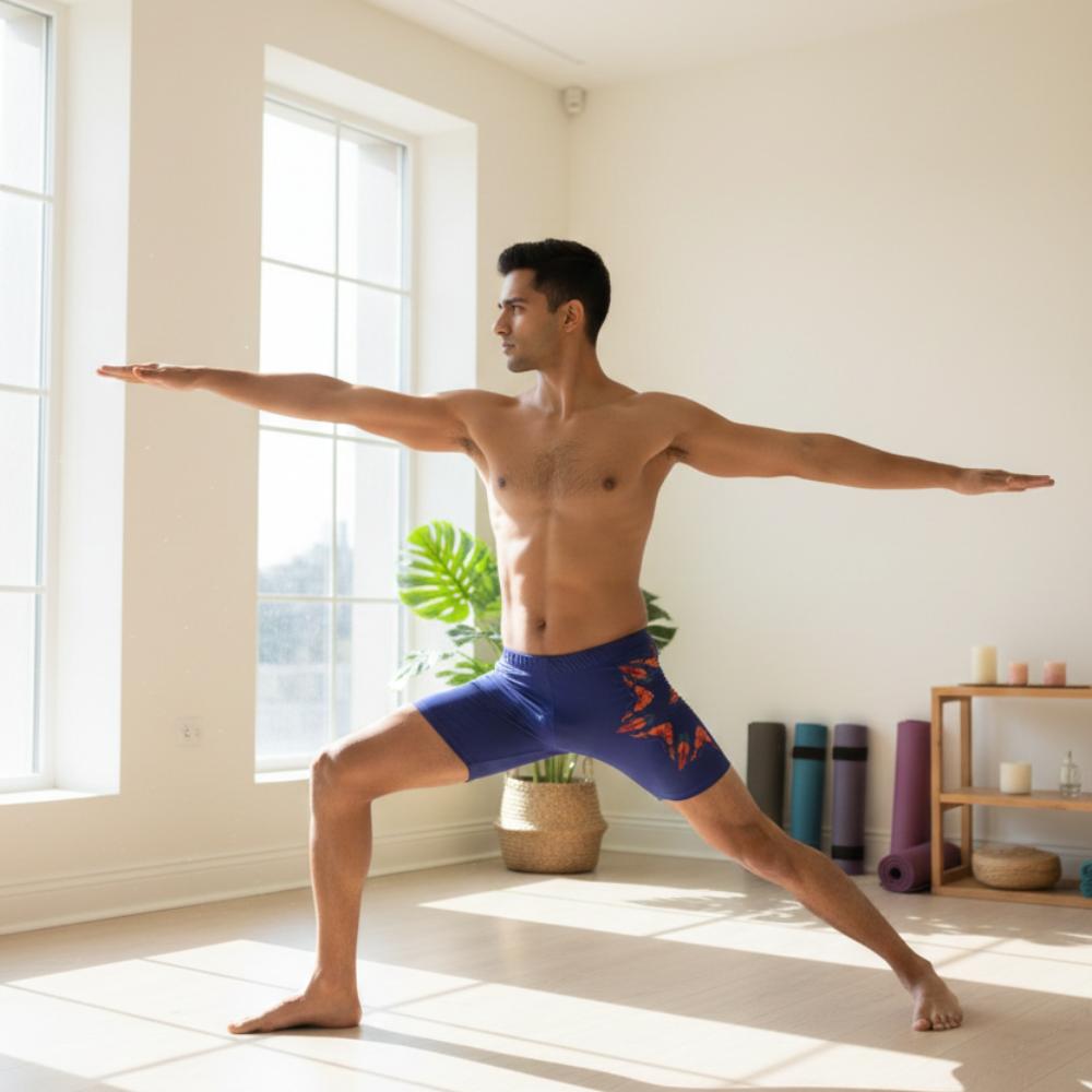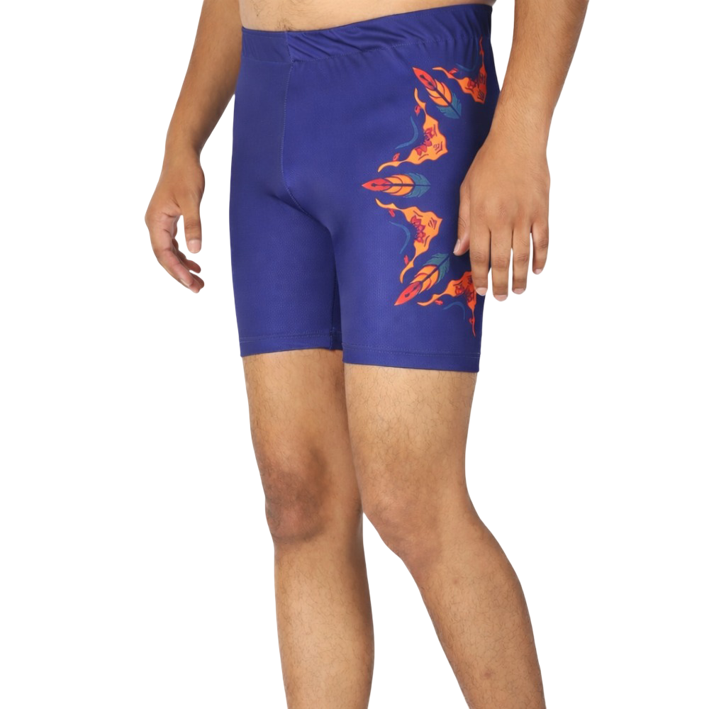 Whether you’re into yoga, gymnastics, Mallakhamb, cycling, aerobics, or strength workouts, these unisex performance shorts are built to support your body with breathable comfort. The deep blue base with a bold side floral print adds a premium sporty look that stands out in training sessions and stage practice.