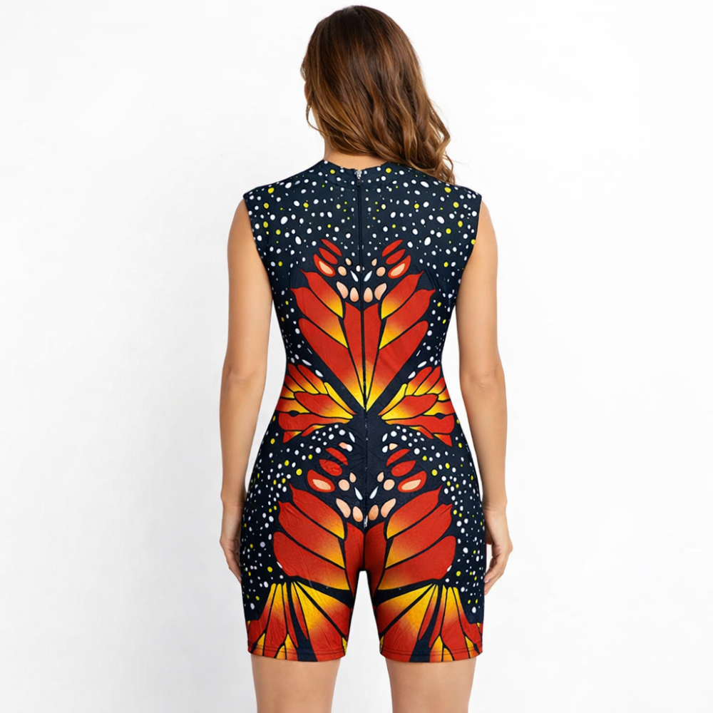 The design features vibrant layers of butterfly-inspired textures in black, rust, yellow, and white that seem to float even when you are not in motion. With a sleeveless cut, rib-finished neckline, and smooth back zip, this piece offers a sleek fit. Lightweight, tough, and fluidโthis biketard thrives when the routine gets intense.