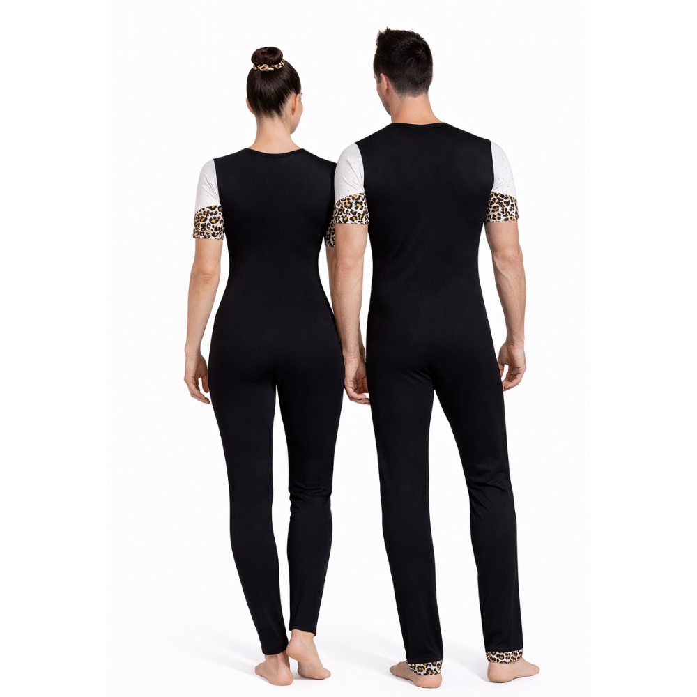 Namami unisex is Made from high-quality lycra fabric, ensuring flexibility and comfort, ideal for yoga, rhythmic gymnastics, devotional dance, and other physical activities. The front chest area features a striking design inspired by Lord Shiva’s iconic leopard skin, with white as the base color. Red and black patchwork intricately highlight this area, adding depth and a touch of elegance.The unitard has half sleeves designed with a vibrant leopard print, symbolizing strength and ferocity. A high-neck design offers a sophisticated look, with the same leopard print continuing subtly around the neckline. The unitard has a sleek leopard print with a discreet back zip for easy wearability, blending seamlessly into the overall design. This unitard is perfect for those looking to combine spirituality with physical expression in their practice.