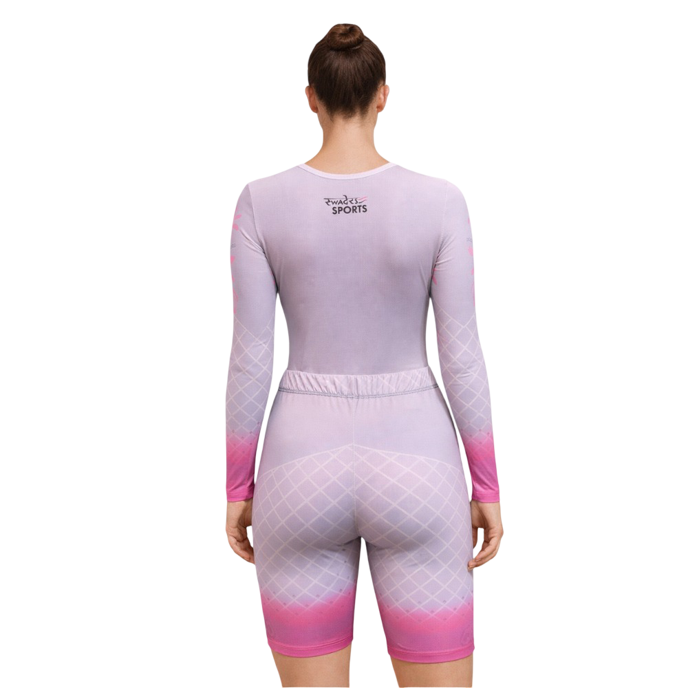 Made from premium stretch Lycra, the leotard provides a smooth, body-hugging fit that allows unrestricted movement during high-intensity routines. The full-sleeve top offers added coverage and support, while the matching fitted shorts ensure stability, flexibility, and comfort during jumps, stretches, inversions, and complex transitions.