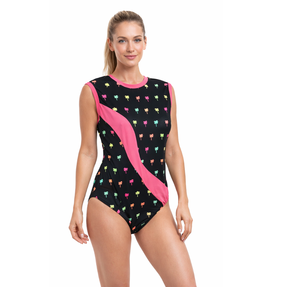 Step into style and confidence with this chic Printed Pink Palm Sleeveless Leotard, designed for girls and women who love to move freely and look fashionable while training or performing. The leotard features a sleek black base decorated with tiny pink palm motifs, giving it a fun, tropical-inspired look.
