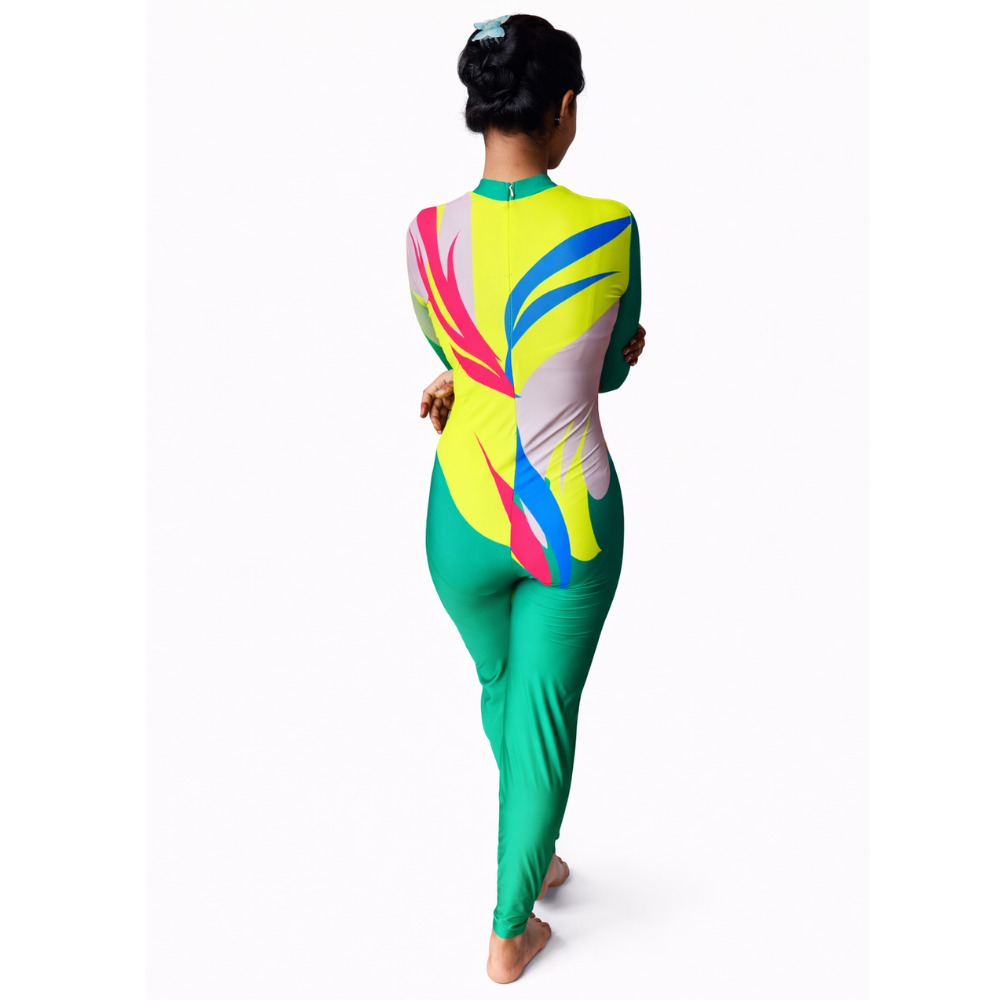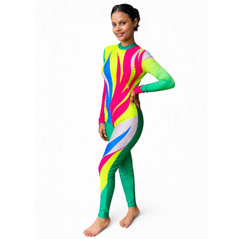 Step into the spotlight with the Prism Pop Printed Unitard, a dynamic blend of vibrant colors and sparkling details. Featuring a stunning mix of bright green, blue, hot pink, and lemon yellow, this full-sleeve unitard is a bold expression of movement and style.