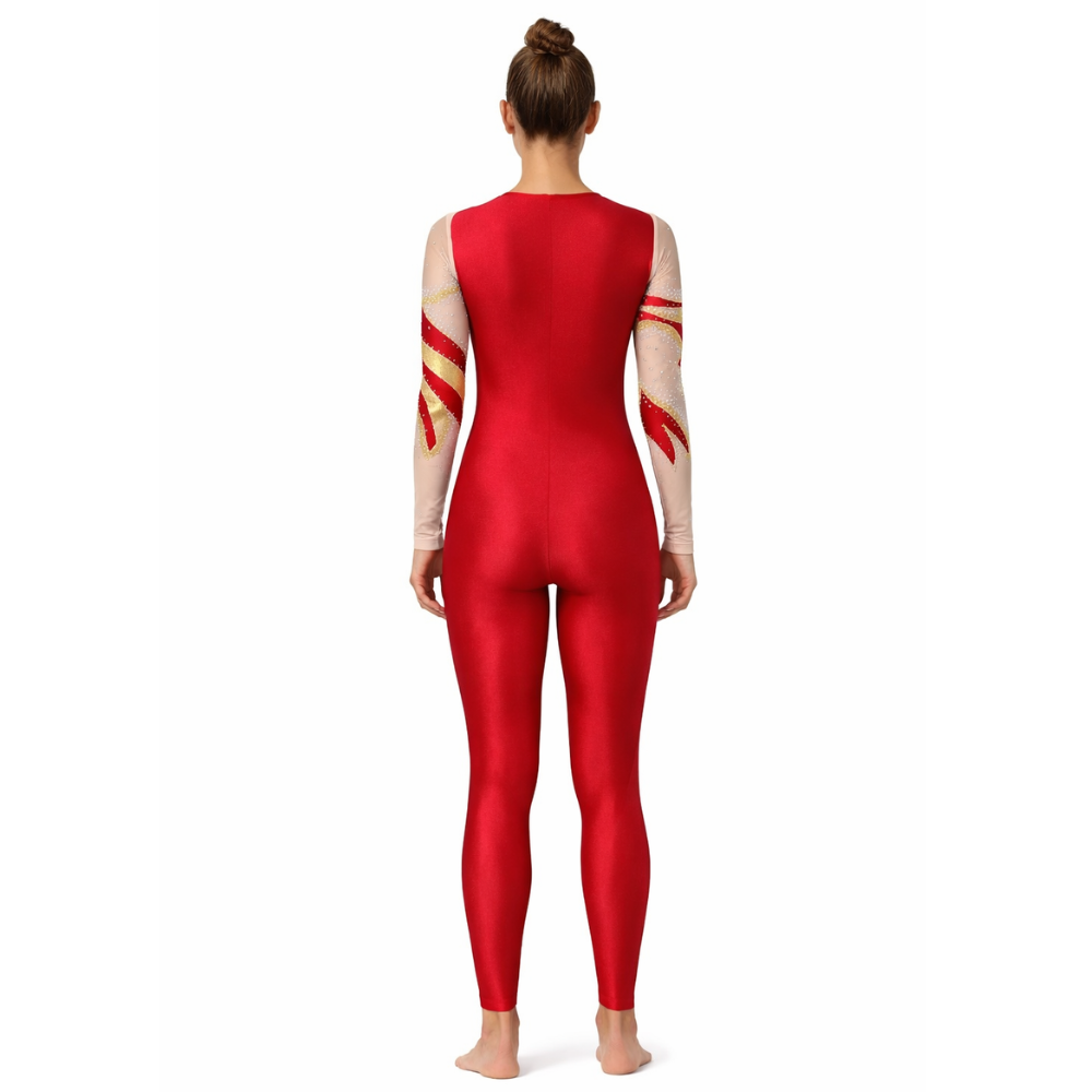 - Contrast Touches: Skin-tone accents at the sleeve ends and unitard bottom bring out the richness of the red and gold, creating a beautifully balanced silhouette.