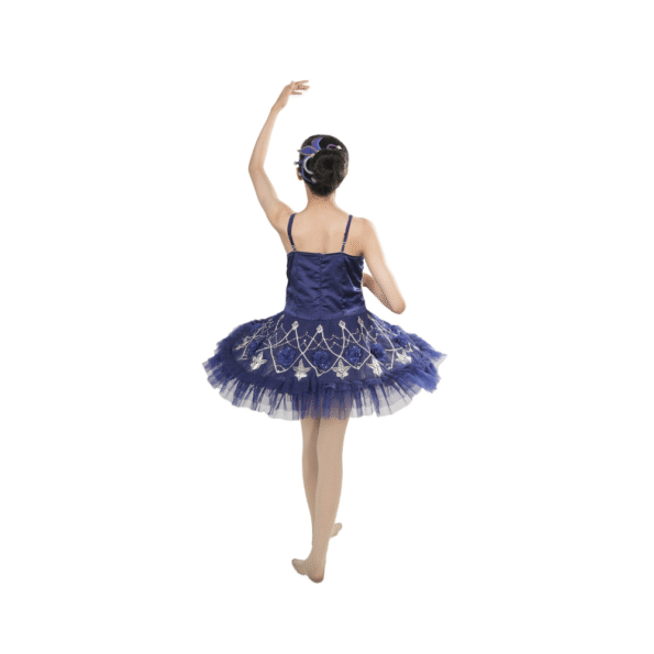 The dress features multi-layers of soft mesh that create a voluminous tutu skirt, beautifully embellished with silver lace and silver-blue stones for a graceful sparkle under stage lights.