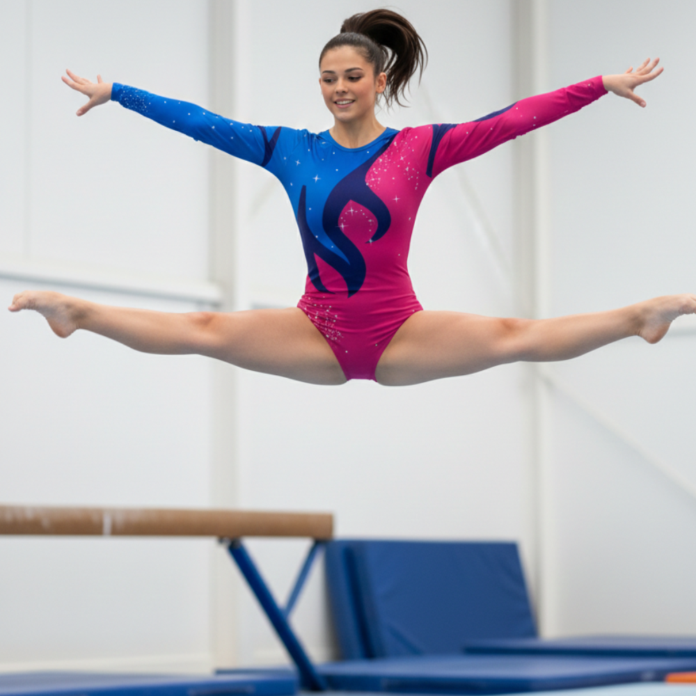 The eye-catching sublimation print features a striking blue design on the right chest and right sleeve, while the rest of the leotard comes in a graceful pink base, creating an amazing and elegant look. Designed with a classic round neck for comfort and a neat finish, it’s ideal for gymnastics, dance, yoga, and stage performances.