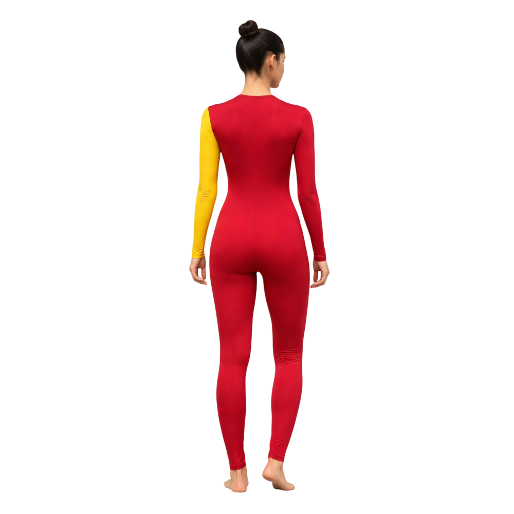 This vibrant red and yellow unitard is designed for a variety of physical activities, including devotional dance, yoga, acrobatics, and aerobics. Crafted with full sleeves for added coverage and flexibility, the unitard provides a snug yet comfortable fit that allows for unrestricted movement. The unique blend of red and yellow creates a visually striking appearance, ideal for performances or spiritual expressions in devotional dance. Intricate stone work embellishes the garment, adding an elegant touch of sparkle, making it suitable for both practice and stage performances. Made from high-quality, breathable fabric, this unitard is perfect for intense physical activities such as yoga or aerobics, offering moisture-wicking properties to keep you comfortable throughout your workout. Its flexible design ensures maximum mobility, whether you’re performing acrobatic moves or engaging in a deep yoga stretch. Versatile, stylish, and functional, this unitard is the perfect addition to your wardrobe for any physical activity that demands both grace and strength.