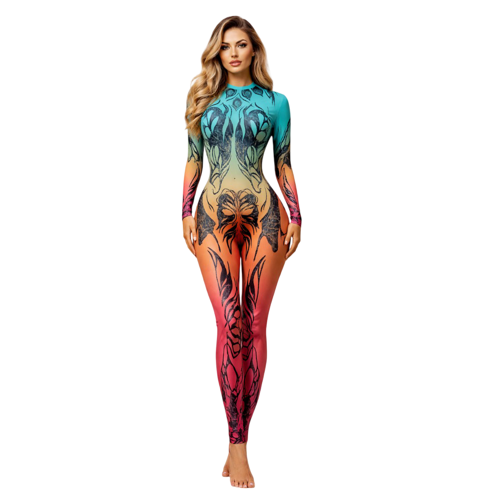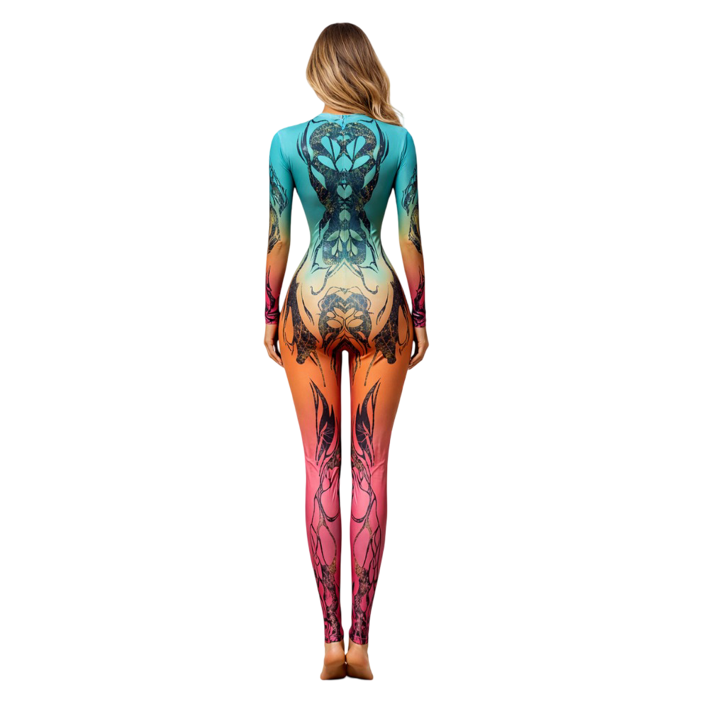 - This costume comes in multi-color sublimation print and features a captivating sea green to rust ombre base, topped with a black random butterfly print that adds elegance and energy.