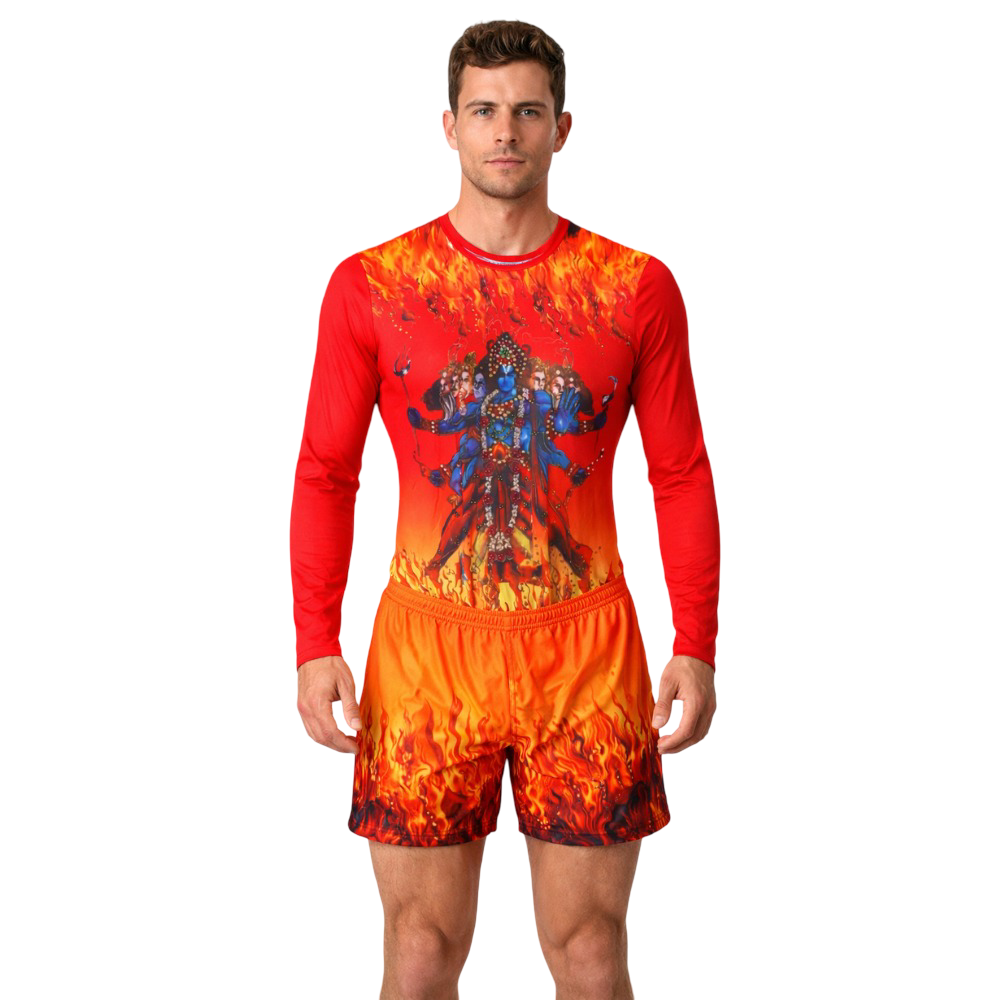 Make a bold spiritual statement with this exclusive sublimation-print unisex leotard, designed for yoga and devotional dance performances. Featuring a striking yellow–orange–red colour palette, the design symbolizes divine energy, power, and transformation.