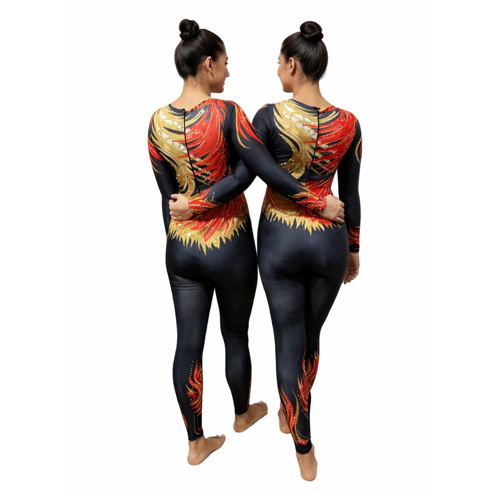 Make a bold statement with this dynamic unisex unitard, designed for performers who demand comfort, flexibility, and visual impact. Featuring a deep black base enhanced by vibrant shades of red, orange, and beige, the unique bush-inspired design is brought to life with sparkling multi-colored stones.