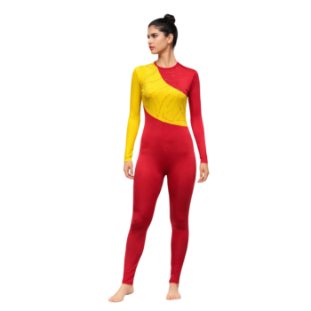 This striking unitard is ideal for creative yoga sessions, dance performances, or any physical activity. The fully stretched lycra fabric ensures maximum flexibility and comfort, making it ideal for any aerobic activities you perform. Easy to wear, the dress features round neck style with a handy rear zip. The distinctive sublimation print has a vivid appearance, thanks to the combination of mustard, flesh, and other color patterns. The right sleeve contrasts in black with a leopard print, while the left sleeve is made with a flesh tone and print. Its adaptability is increased by the biketard style, which permits unhindered mobility. This ensemble is a unique choice for any performance or exercise session because of its striking beauty and useful functionality.