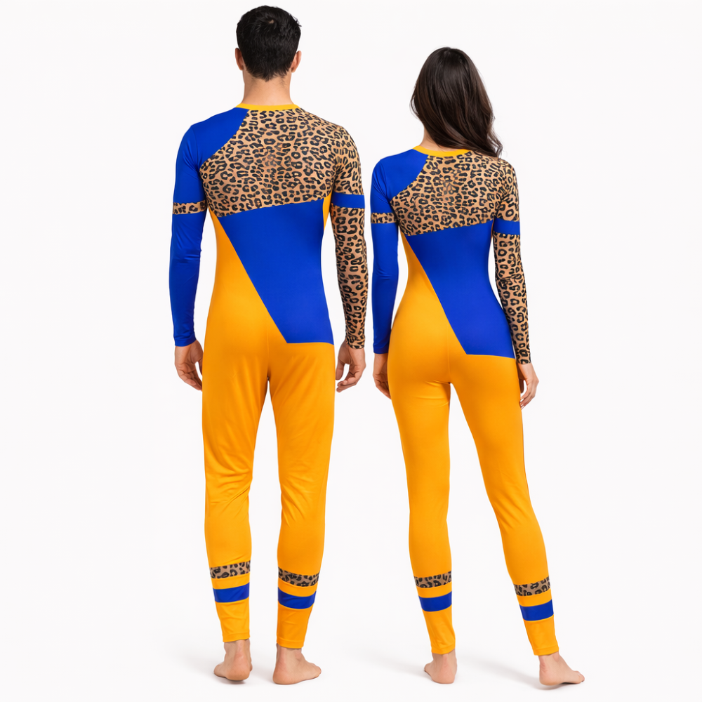 Vibrant Leopard Texture Unitard in Blue and Yellow Color